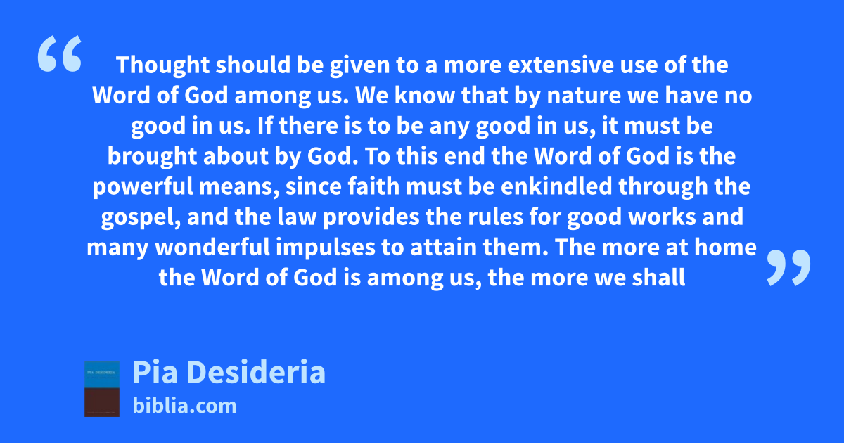 Thought should be given to a more extensive use of the Word of God among us. We know that by nature we have no good in us. If there is to be any good in us, it must be brought about by God. To this end the Word of God is the powerful means, since faith must be enkindled through the gospel, and the law provides the rules for good works and many wonderful impulses to attain them. The more at home the Word of God is among us, the more we shall