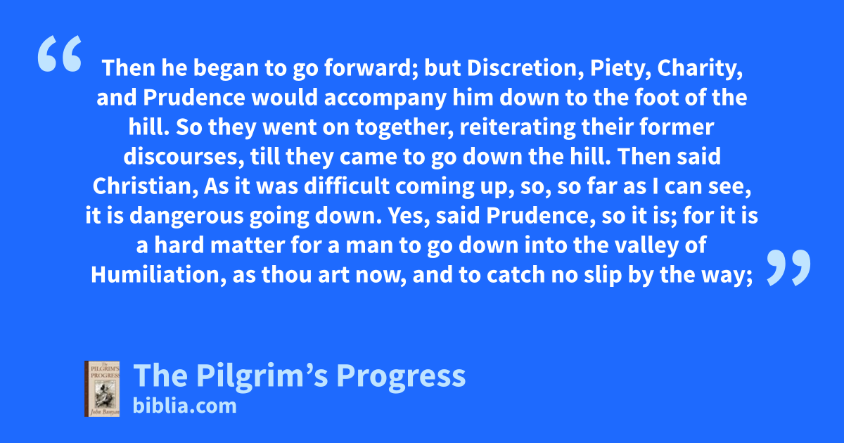Then he began to go forward; but Discretion, Piety, Charity, and Prudence would accompany him down to the foot of the hill. So they went on together, reiterating their former discourses, till they came to go down the hill. Then said Christian, As it was difficult coming up, so, so far as I can see, it is dangerous going down. Yes, said Prudence, so it is; for it is a hard matter for a man to go down into the valley of Humiliation, as thou art now, and to catch no slip by the way; therefore, said they, we are come out to accompany thee down the hill. So he began to go down, but very warily; yet he caught a slip or two.