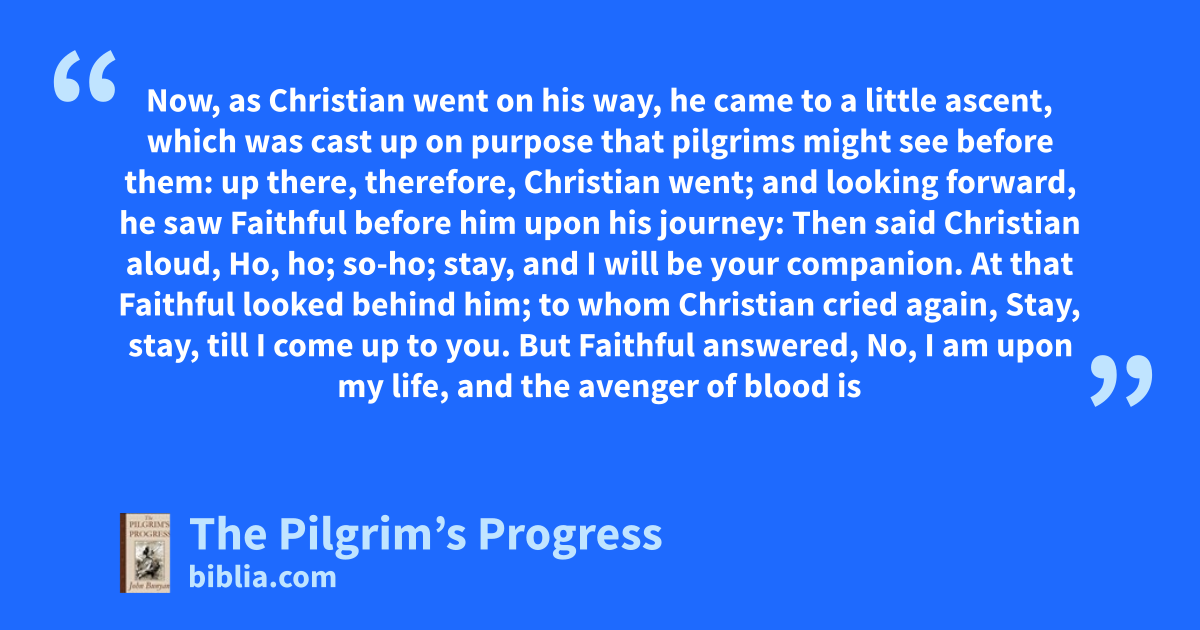 Now, as Christian went on his way, he came to a little ascent, which was cast up on purpose that pilgrims might see before them: up there, therefore, Christian went; and looking forward, he saw Faithful before him upon his journey: Then said Christian aloud, Ho, ho; so-ho; stay, and I will be your companion. At that Faithful looked behind him; to whom Christian cried again, Stay, stay, till I come up to you. But Faithful answered, No, I am upon my life, and the avenger of blood is behind me.