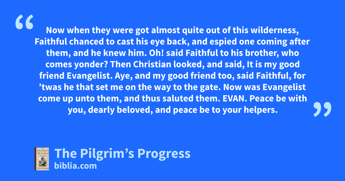 Now when they were got almost quite out of this wilderness, Faithful chanced to cast his eye back, and espied one coming after them, and he knew him. Oh! said Faithful to his brother, who comes yonder? Then Christian looked, and said, It is my good friend Evangelist. Aye, and my good friend too, said Faithful, for ’twas he that set me on the way to the gate. Now was Evangelist come up unto them, and thus saluted them.