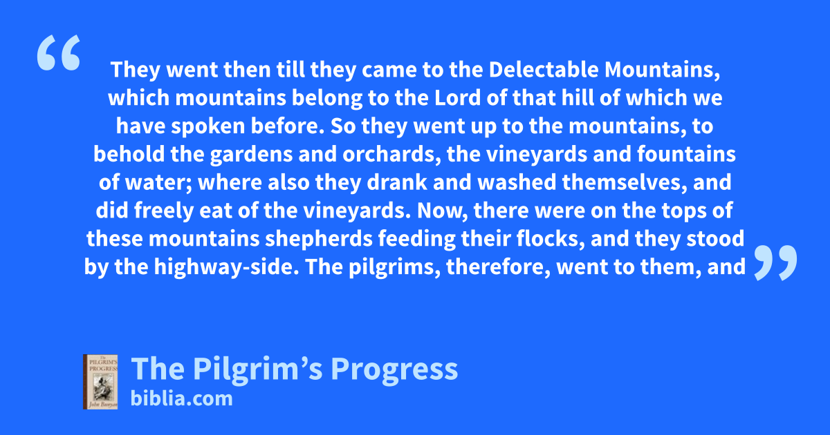 They went then till they came to the Delectable Mountains, which mountains belong to the Lord of that hill of which we have spoken before. So they went up to the mountains, to behold the gardens and orchards, the vineyards and fountains of water; where also they drank and washed themselves, and did freely eat of the vineyards. Now, there were on the tops of these mountains shepherds feeding their flocks, and they stood by the highway-side. The pilgrims, therefore, went to them, and leaning upon their staffs, (as is common with weary pilgrims when they stand to talk with any by the way,) they asked, Whose Delectable Mountains are these; and whose be the sheep that feed upon them?