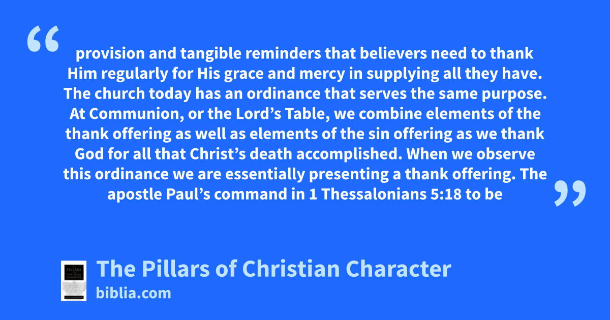 provision and tangible reminders that believers need to thank Him regularly for His grace and mercy in supplying all they have. The church today has an ordinance that serves the same purpose. At Communion, or the Lord’s Table, we combine elements of the thank offering as well as elements of the sin offering as we thank God for all that Christ’s death accomplished. When we observe this ordinance we are essentially presenting a thank offering. The apostle Paul’s command in 1 Thessalonians 5:18 to be