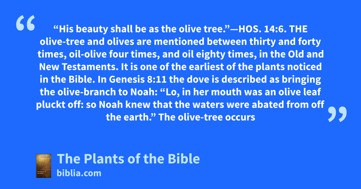 “His beauty shall be as the olive tree.”—HOS. 14:6. THE olive-tree and olives are mentioned between thirty and forty times, oil-olive four times, and oil eighty times, in the Old and New Testaments. It is one of the earliest of the plants noticed in the Bible. In Genesis 8:11 the dove is described as bringing the olive-branch to Noah: “Lo, in her mouth was an olive leaf pluckt off: so Noah knew that the waters were abated from off the earth.” The olive-tree occurs