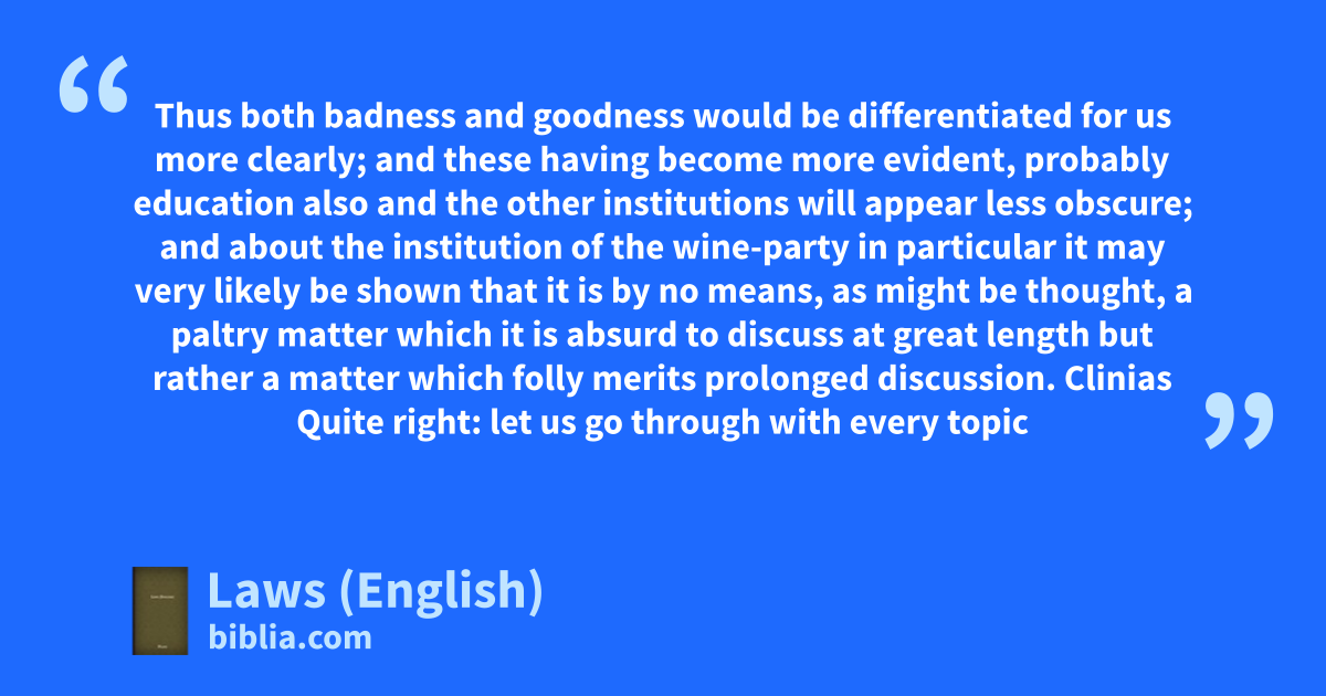 Thus both badness and goodness would be differentiated for us more clearly; and these having become more evident, probably education also and the other institutions will appear less obscure; and about the institution of the wine-party in particular it may very likely be shown that it is by no means, as might be thought, a paltry matter which it is absurd to discuss at great length but rather a matter which folly merits prolonged discussion. Clinias Quite right: let us go through with every topic