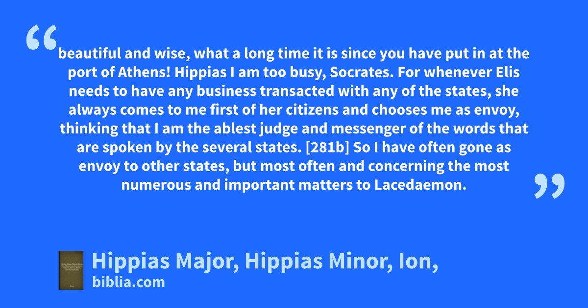 beautiful and wise, what a long time it is since you have put in at the port of Athens! Hippias I am too busy, Socrates. For whenever Elis needs to have any business transacted with any of the states, she always comes to me first of her citizens and chooses me as envoy, thinking that I am the ablest judge and messenger of the words that are spoken by the several states. [281b] So I have often gone as envoy to other states, but most often and concerning the most numerous and important matters to Lacedaemon.