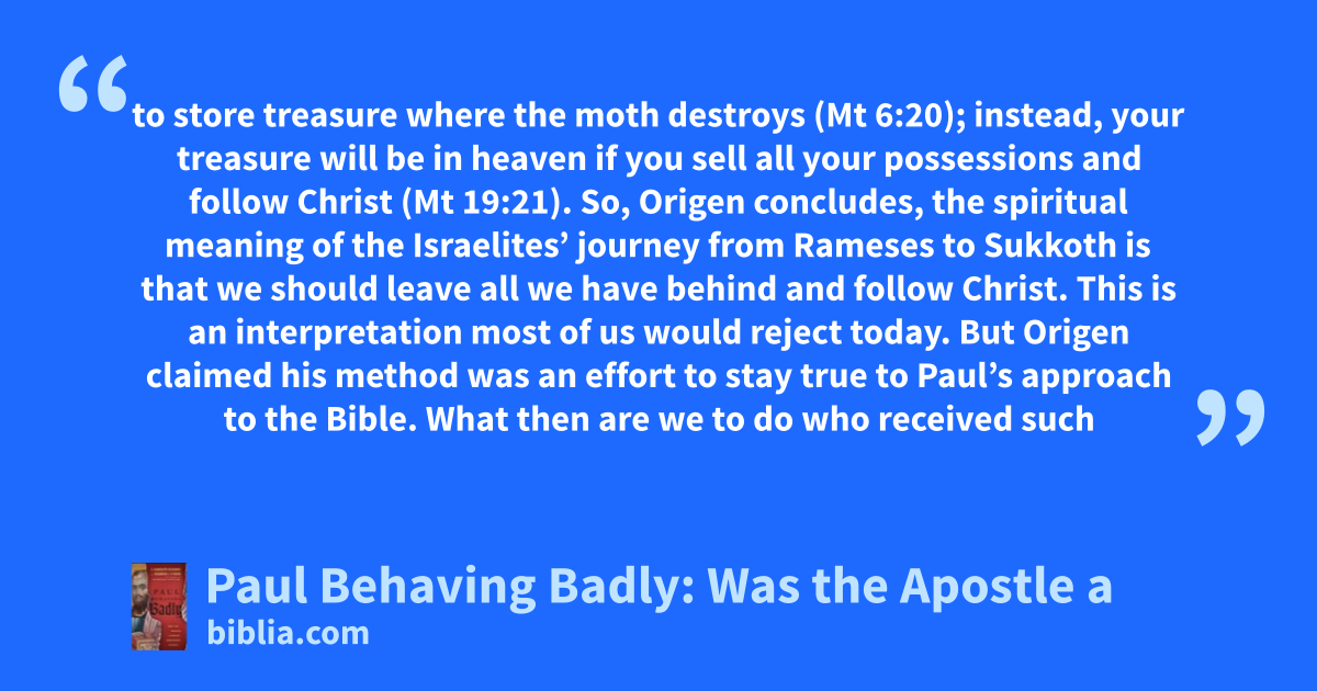 to store treasure where the moth destroys (Mt 6:20); instead, your treasure will be in heaven if you sell all your possessions and follow Christ (Mt 19:21). So, Origen concludes, the spiritual meaning of the Israelites’ journey from Rameses to Sukkoth is that we should leave all we have behind and follow Christ. This is an interpretation most of us would reject today. But Origen claimed his method was an effort to stay true to Paul’s approach to the Bible. What then are we to do who received such