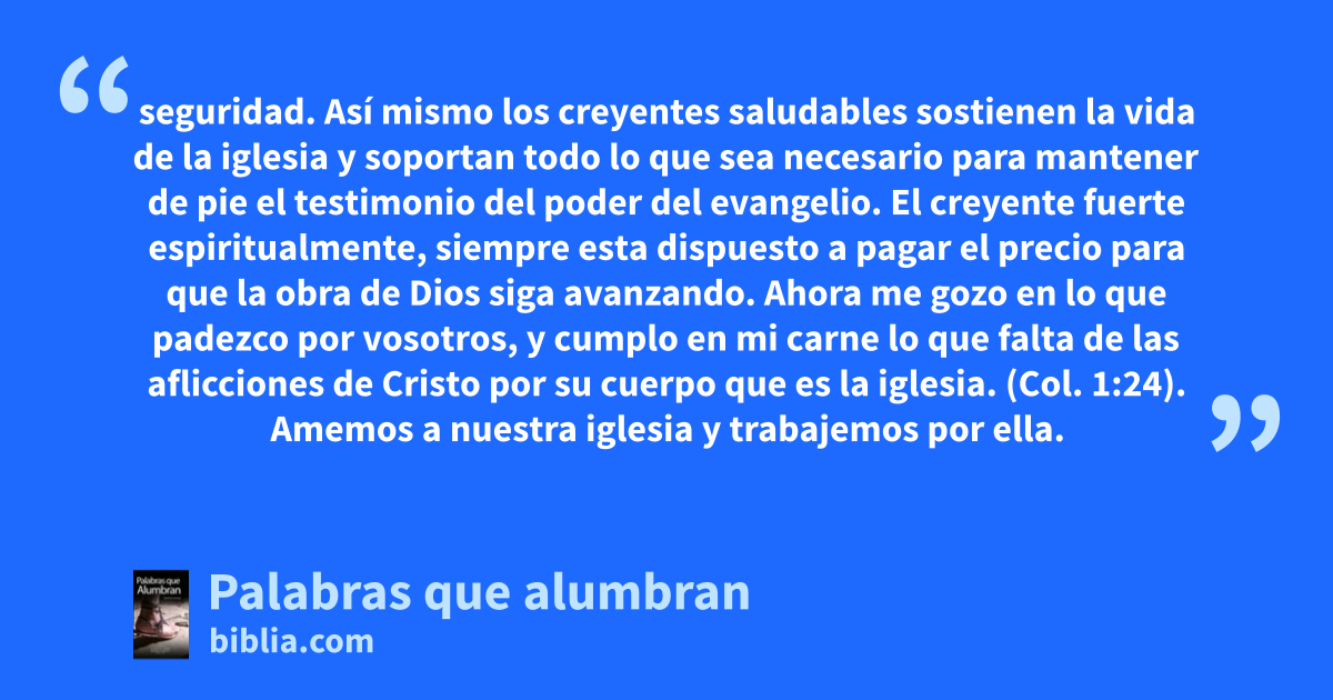 seguridad. Así mismo los creyentes saludables sostienen la vida de la iglesia y soportan todo lo que sea necesario para mantener de pie el testimonio del poder del evangelio. El creyente fuerte espiritualmente, siempre esta dispuesto a pagar el precio para que la obra de Dios siga avanzando. Ahora me gozo en lo que padezco por vosotros, y cumplo en mi carne lo que falta de las aflicciones de Cristo por su cuerpo que es la iglesia. (Col. 1:24). Amemos a nuestra iglesia y trabajemos por ella.