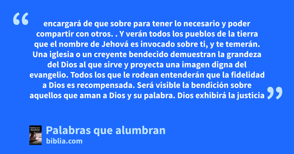 encargará de que sobre para tener lo necesario y poder compartir con otros. . Y verán todos los pueblos de la tierra que el nombre de Jehová es invocado sobre ti, y te temerán. Una iglesia o un creyente bendecido demuestran la grandeza del Dios al que sirve y proyecta una imagen digna del evangelio. Todos los que le rodean entenderán que la fidelidad a Dios es recompensada. Será visible la bendición sobre aquellos que aman a Dios y su palabra. Dios exhibirá la justicia