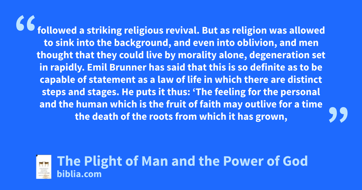 followed a striking religious revival. But as religion was allowed to sink into the background, and even into oblivion, and men thought that they could live by morality alone, degeneration set in rapidly. Emil Brunner has said that this is so definite as to be capable of statement as a law of life in which there are distinct steps and stages. He puts it thus: ‘The feeling for the personal and the human which is the fruit of faith may outlive for a time the death of the roots from which it has grown,