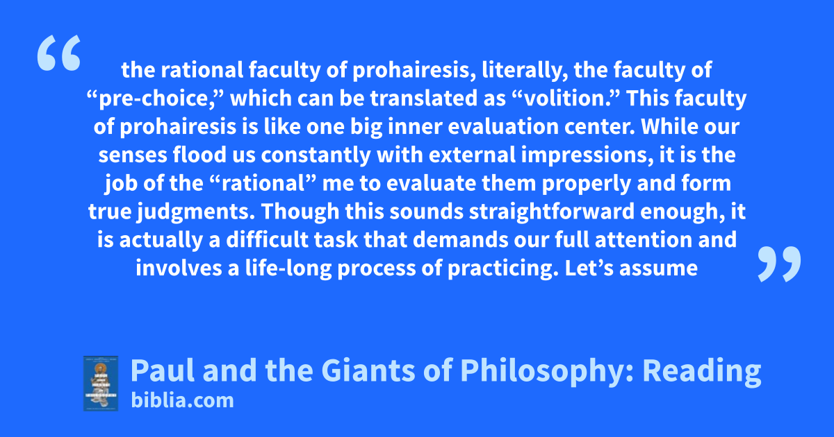 the rational faculty of prohairesis, literally, the faculty of “pre-choice,” which can be translated as “volition.” This faculty of prohairesis is like one big inner evaluation center. While our senses flood us constantly with external impressions, it is the job of the “rational” me to evaluate them properly and form true judgments. Though this sounds straightforward enough, it is actually a difficult task that demands our full attention and involves a life-long process of practicing. Let’s assume
