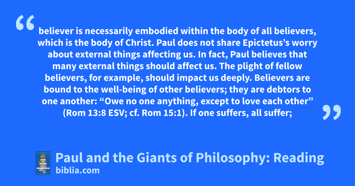 believer is necessarily embodied within the body of all believers, which is the body of Christ. Paul does not share Epictetus’s worry about external things affecting us. In fact, Paul believes that many external things should affect us. The plight of fellow believers, for example, should impact us deeply. Believers are bound to the well-being of other believers; they are debtors to one another: “Owe no one anything, except to love each other” (Rom 13:8 ESV; cf. Rom 15:1). If one suffers, all suffer;