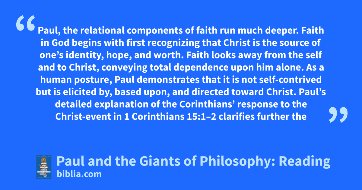 Paul, the relational components of faith run much deeper. Faith in God begins with first recognizing that Christ is the source of one’s identity, hope, and worth. Faith looks away from the self and to Christ, conveying total dependence upon him alone. As a human posture, Paul demonstrates that it is not self-contrived but is elicited by, based upon, and directed toward Christ. Paul’s detailed explanation of the Corinthians’ response to the Christ-event in 1 Corinthians 15:1–2 clarifies further the