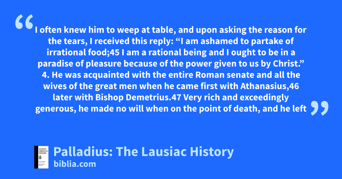 Comprised of biographical sketches of early monastics, Palladius has written an important collection on sixty holy men and women whom he had personally met. The work, dating from around AD 420, is dedicated to Lausus, the royal chamberlain at the court of Emperor Theodosius II.