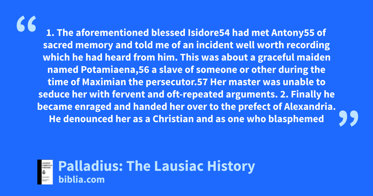 Comprised of biographical sketches of early monastics, Palladius has written an important collection on sixty holy men and women whom he had personally met. The work, dating from around AD 420, is dedicated to Lausus, the royal chamberlain at the court of Emperor Theodosius II.