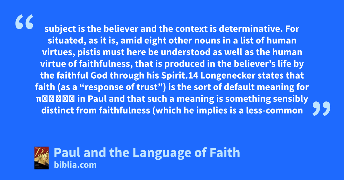subject is the believer and the context is determinative. For situated, as it is, amid eight other nouns in a list of human virtues, pistis must here be understood as well as the human virtue of faithfulness, that is produced in the believer’s life by the faithful God through his Spirit.14 Longenecker states that faith (as a “response of trust”) is the sort of default meaning for πίστις in Paul and that such a meaning is something sensibly distinct from faithfulness (which he implies is a less-common