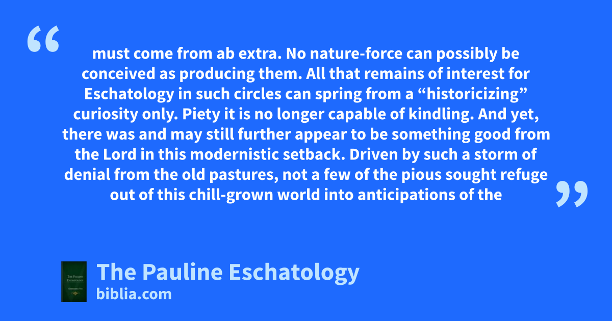 must come from ab extra. No nature-force can possibly be conceived as producing them. All that remains of interest for Eschatology in such circles can spring from a “historicizing” curiosity only. Piety it is no longer capable of kindling. And yet, there was and may still further appear to be something good from the Lord in this modernistic setback. Driven by such a storm of denial from the old pastures, not a few of the pious sought refuge out of this chill-grown world into anticipations of the