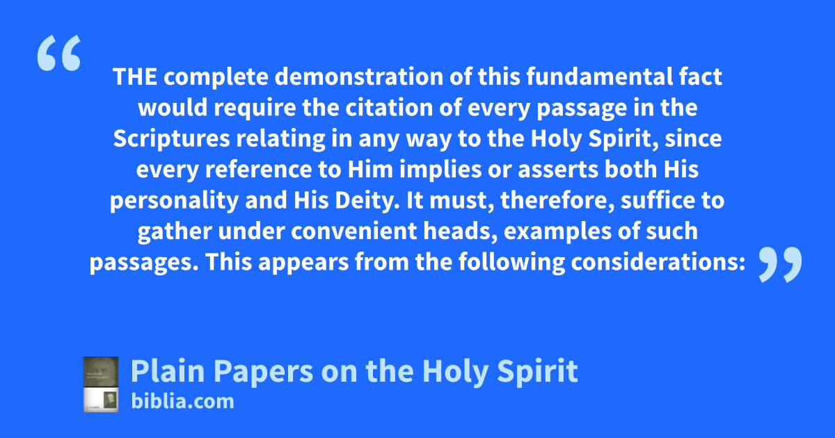 THE complete demonstration of this fundamental fact would require the citation of every passage in the Scriptures relating in any way to the Holy Spirit, since every reference to Him implies or asserts both His personality and His Deity. It must, therefore, suffice to gather under convenient heads, examples of such passages. This appears from the following considerations: