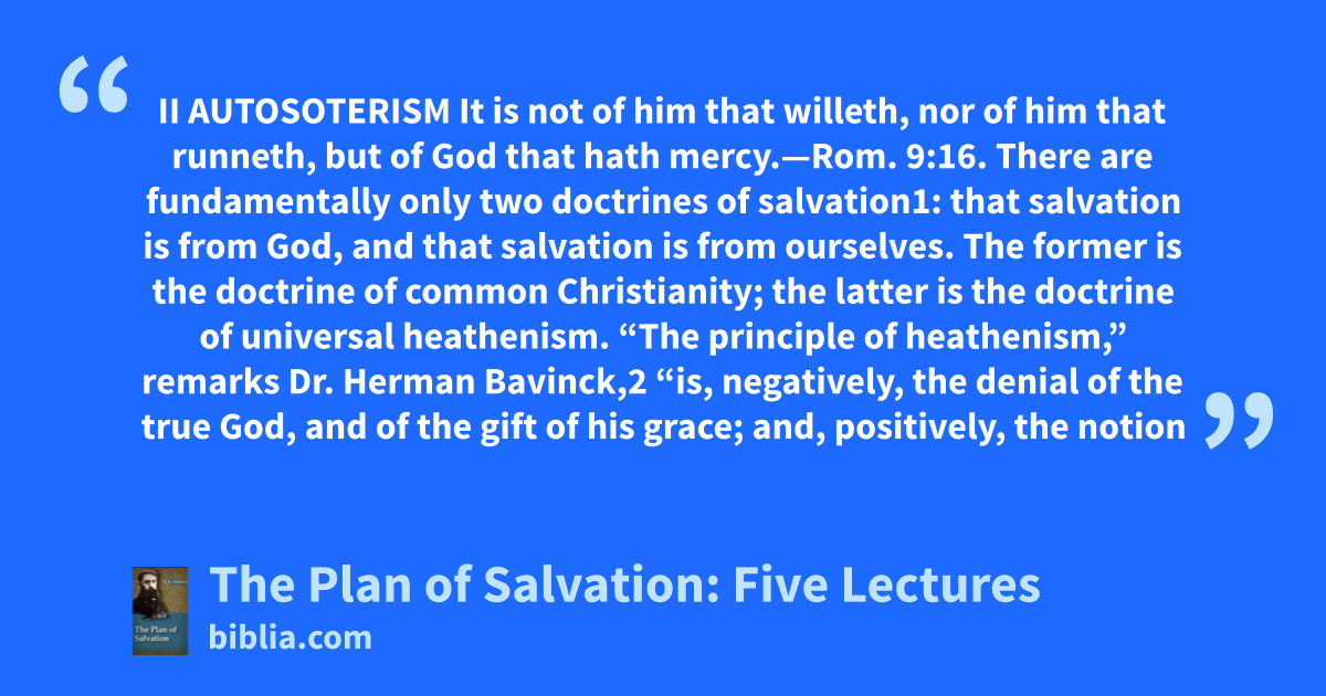 II AUTOSOTERISM It is not of him that willeth, nor of him that runneth, but of God that hath mercy.—Rom. 9:16. There are fundamentally only two doctrines of salvation1: that salvation is from God, and that salvation is from ourselves. The former is the doctrine of common Christianity; the latter is the doctrine of universal heathenism. “The principle of heathenism,” remarks Dr. Herman Bavinck,2 “is, negatively, the denial of the true God, and of the gift of his grace; and, positively, the notion