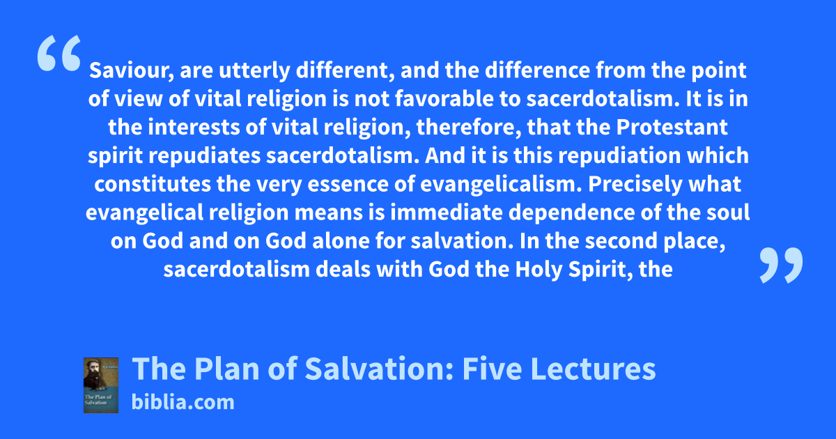 Saviour, are utterly different, and the difference from the point of view of vital religion is not favorable to sacerdotalism. It is in the interests of vital religion, therefore, that the Protestant spirit repudiates sacerdotalism. And it is this repudiation which constitutes the very essence of evangelicalism. Precisely what evangelical religion means is immediate dependence of the soul on God and on God alone for salvation. In the second place, sacerdotalism deals with God the Holy Spirit, the