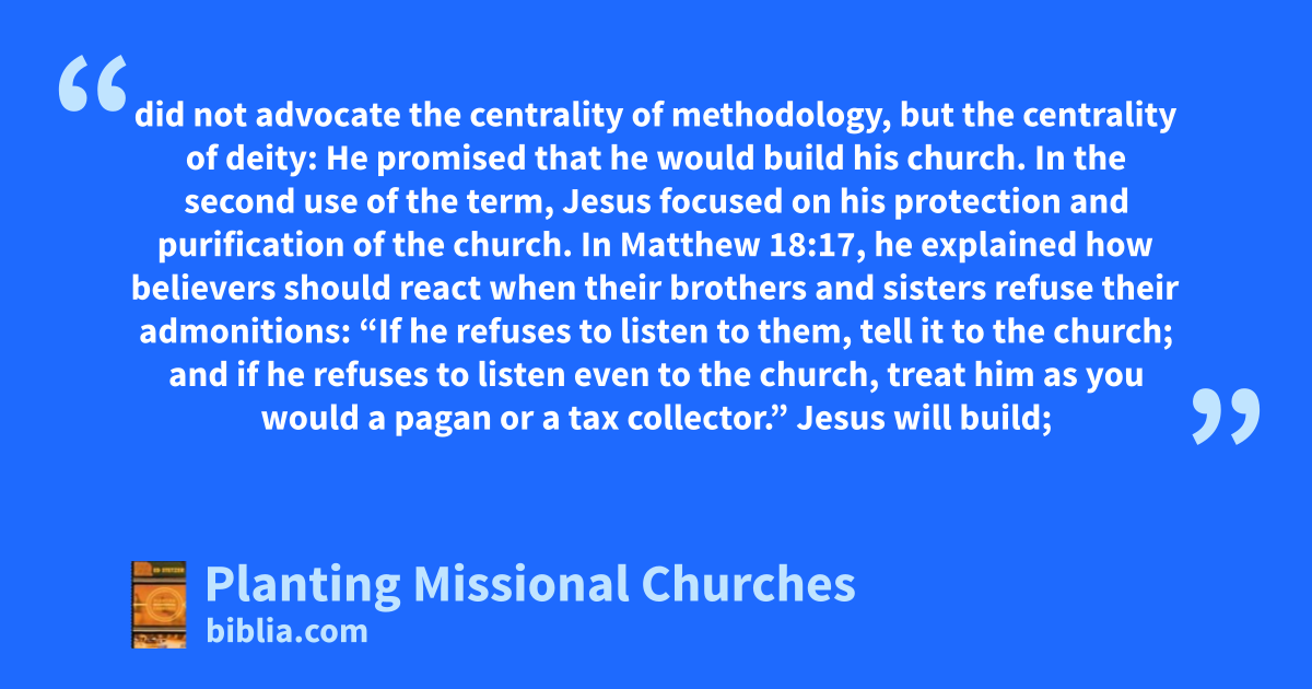 did not advocate the centrality of methodology, but the centrality of deity: He promised that he would build his church. In the second use of the term, Jesus focused on his protection and purification of the church. In Matthew 18:17, he explained how believers should react when their brothers and sisters refuse their admonitions: “If he refuses to listen to them, tell it to the church; and if he refuses to listen even to the church, treat him as you would a pagan or a tax collector.” Jesus will build;