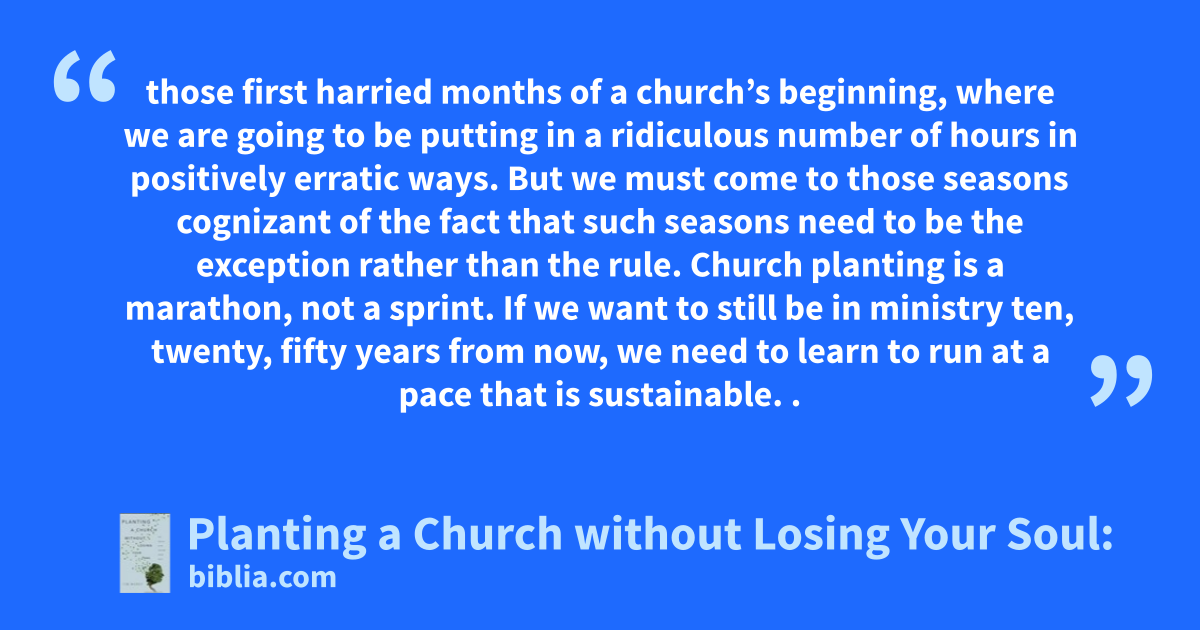 those first harried months of a church’s beginning, where we are going to be putting in a ridiculous number of hours in positively erratic ways. But we must come to those seasons cognizant of the fact that such seasons need to be the exception rather than the rule. Church planting is a marathon, not a sprint. If we want to still be in ministry ten, twenty, fifty years from now, we need to learn to run at a pace that is sustainable. .