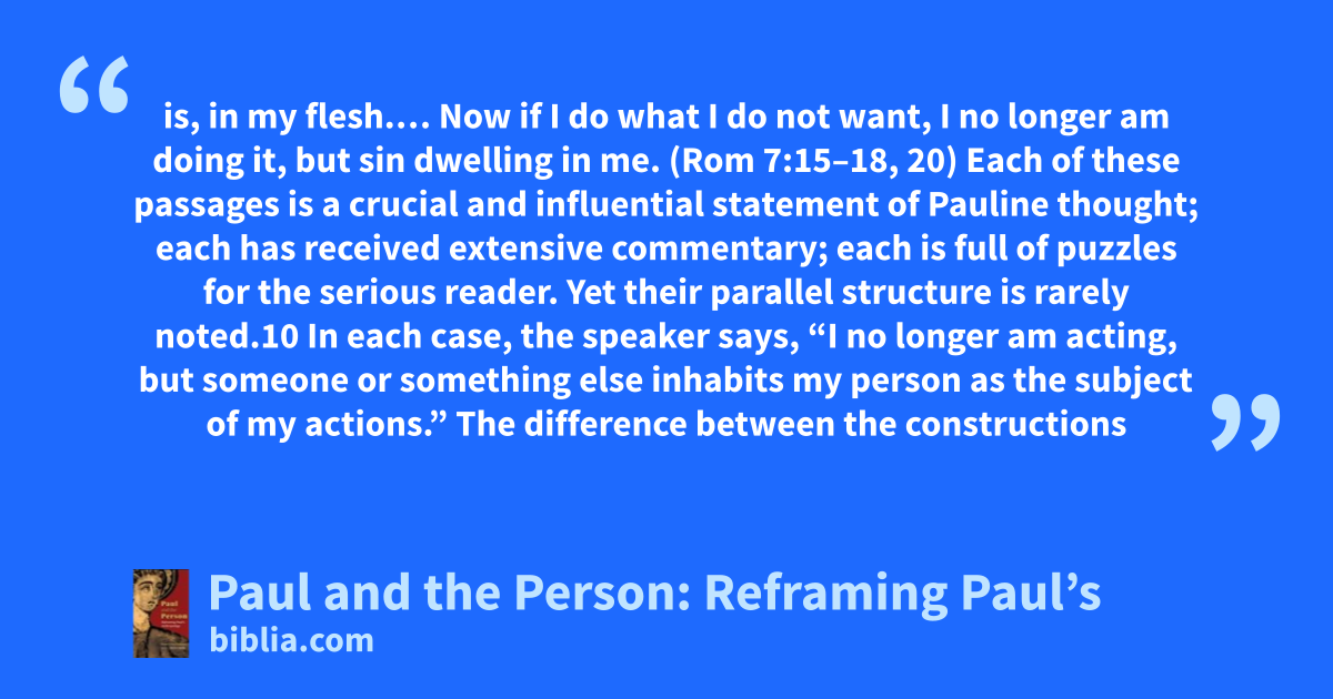 is, in my flesh.… Now if I do what I do not want, I no longer am doing it, but sin dwelling in me. (Rom 7:15–18, 20) Each of these passages is a crucial and influential statement of Pauline thought; each has received extensive commentary; each is full of puzzles for the serious reader. Yet their parallel structure is rarely noted.10 In each case, the speaker says, “I no longer am acting, but someone or something else inhabits my person as the subject of my actions.” The difference between the constructions