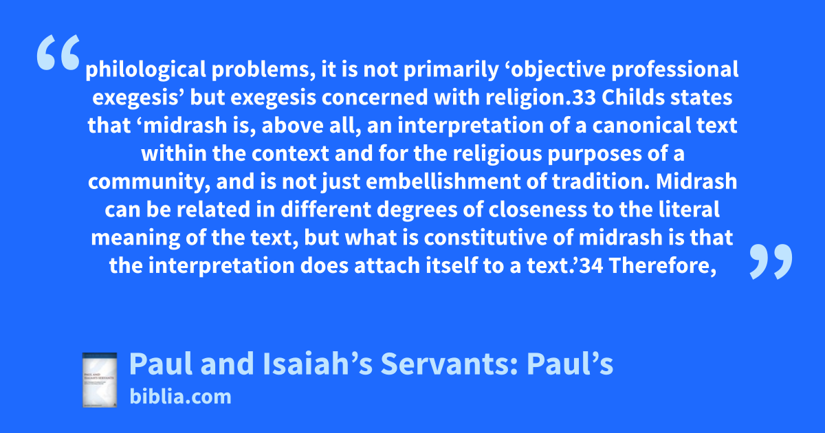 philological problems, it is not primarily ‘objective professional exegesis’ but exegesis concerned with religion.33 Childs states that ‘midrash is, above all, an interpretation of a canonical text within the context and for the religious purposes of a community, and is not just embellishment of tradition. Midrash can be related in different degrees of closeness to the literal meaning of the text, but what is constitutive of midrash is that the interpretation does attach itself to a text.’34 Therefore,