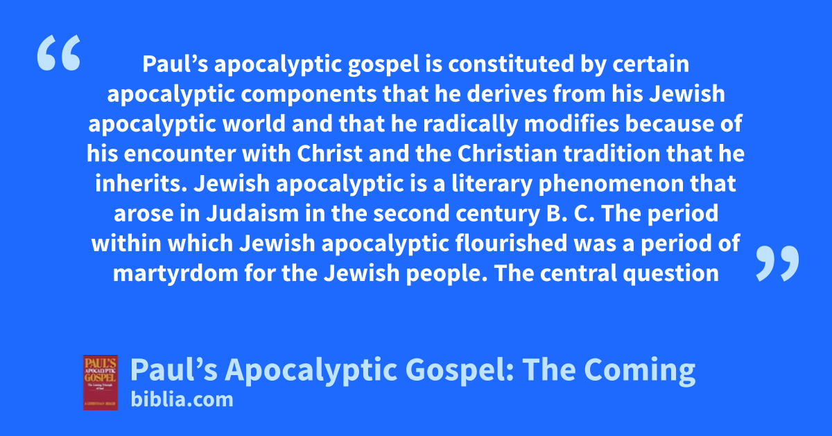 Paul’s apocalyptic gospel is constituted by certain apocalyptic components that he derives from his Jewish apocalyptic world and that he radically modifies because of his encounter with Christ and the Christian tradition that he inherits. Jewish apocalyptic is a literary phenomenon that arose in Judaism in the second century B. C. The period within which Jewish apocalyptic flourished was a period of martyrdom for the Jewish people. The central question