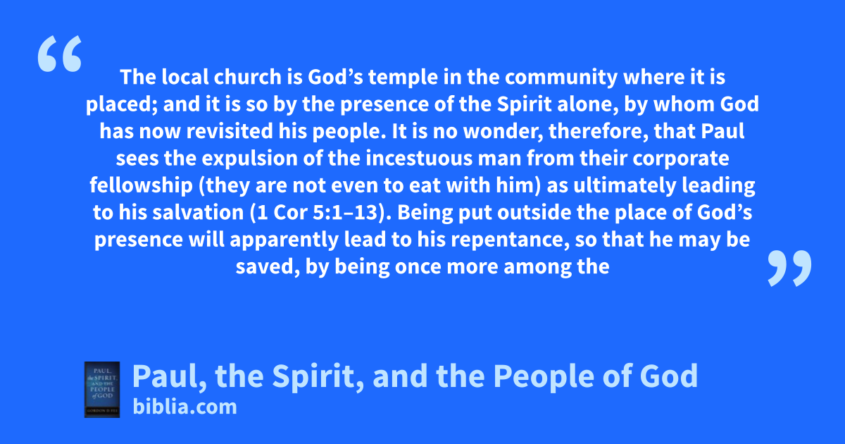 The local church is God’s temple in the community where it is placed; and it is so by the presence of the Spirit alone, by whom God has now revisited his people. It is no wonder, therefore, that Paul sees the expulsion of the incestuous man from their corporate fellowship (they are not even to eat with him) as ultimately leading to his salvation (1 Cor 5:1–13). Being put outside the place of God’s presence will apparently lead to his repentance, so that he may be saved, by being once more among the