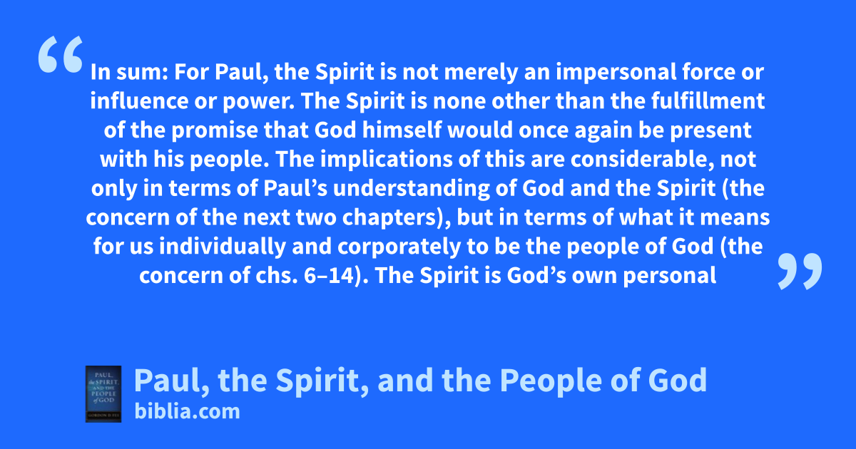 In sum: For Paul, the Spirit is not merely an impersonal force or influence or power. The Spirit is none other than the fulfillment of the promise that God himself would once again be present with his people. The implications of this are considerable, not only in terms of Paul’s understanding of God and the Spirit (the concern of the next two chapters), but in terms of what it means for us individually and corporately to be the people of God (the concern of chs. 6–14). The Spirit is God’s own personal
