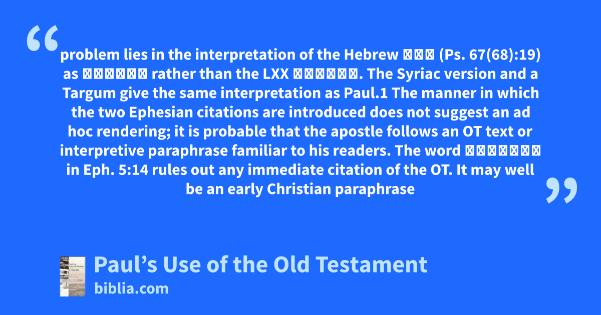 problem lies in the interpretation of the Hebrew לקח (Ps. 67(68):19) as ἔδωκεν rather than the LXX ἔλαβες. The Syriac version and a Targum give the same interpretation as Paul.1 The manner in which the two Ephesian citations are introduced does not suggest an ad hoc rendering; it is probable that the apostle follows an OT text or interpretive paraphrase familiar to his readers. The word Χριστός in Eph. 5:14 rules out any immediate citation of the OT. It may well be an early Christian paraphrase