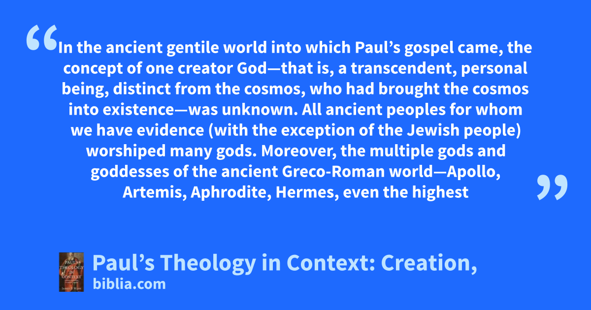 In the ancient gentile world into which Paul’s gospel came, the concept of one creator God—that is, a transcendent, personal being, distinct from the cosmos, who had brought the cosmos into existence—was unknown. All ancient peoples for whom we have evidence (with the exception of the Jewish people) worshiped many gods. Moreover, the multiple gods and goddesses of the ancient Greco-Roman world—Apollo, Artemis, Aphrodite, Hermes, even the highest