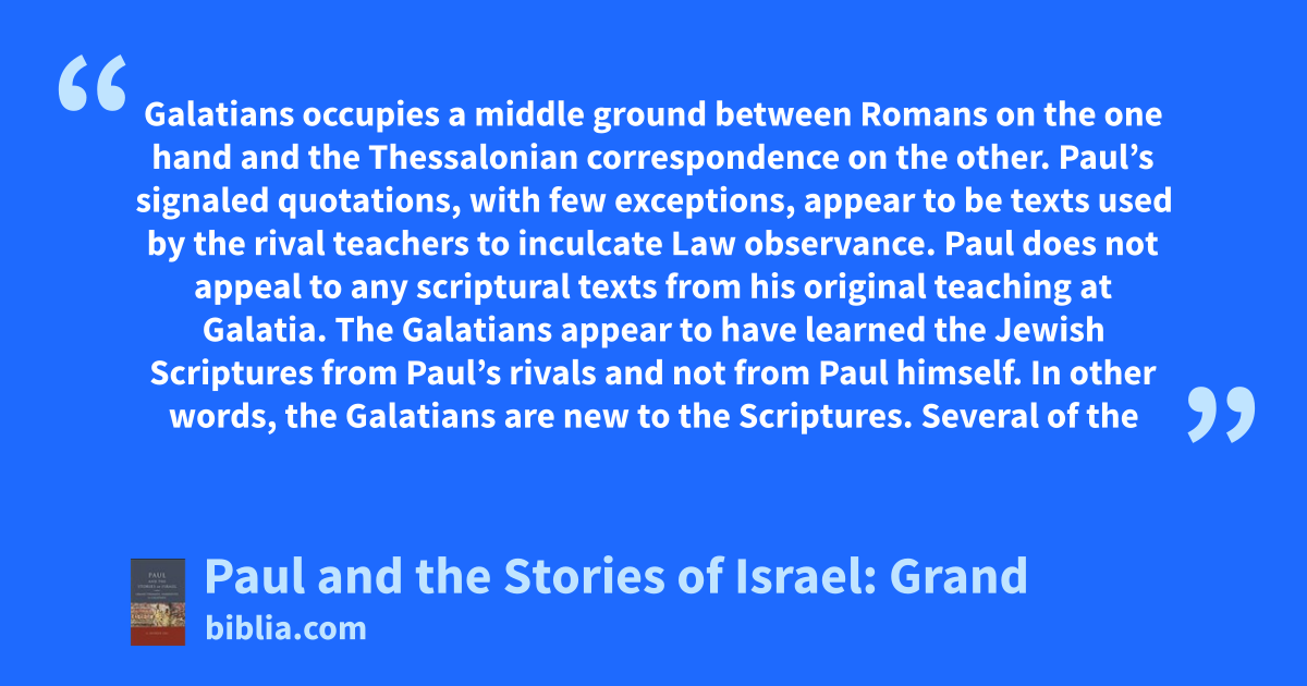 Galatians occupies a middle ground between Romans on the one hand and the Thessalonian correspondence on the other. Paul’s signaled quotations, with few exceptions, appear to be texts used by the rival teachers to inculcate Law observance. Paul does not appeal to any scriptural texts from his original teaching at Galatia. The Galatians appear to have learned the Jewish Scriptures from Paul’s rivals and not from Paul himself. In other words, the Galatians are new to the Scriptures. Several of the