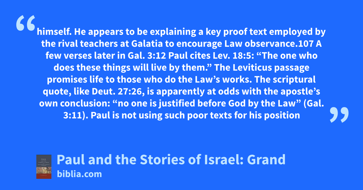 himself. He appears to be explaining a key proof text employed by the rival teachers at Galatia to encourage Law observance.107 A few verses later in Gal. 3:12 Paul cites Lev. 18:5: “The one who does these things will live by them.” The Leviticus passage promises life to those who do the Law’s works. The scriptural quote, like Deut. 27:26, is apparently at odds with the apostle’s own conclusion: “no one is justified before God by the Law” (Gal. 3:11). Paul is not using such poor texts for his position