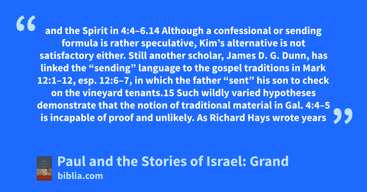 and the Spirit in 4:4–6.14 Although a confessional or sending formula is rather speculative, Kim’s alternative is not satisfactory either. Still another scholar, James D. G. Dunn, has linked the “sending” language to the gospel traditions in Mark 12:1–12, esp. 12:6–7, in which the father “sent” his son to check on the vineyard tenants.15 Such wildly varied hypotheses demonstrate that the notion of traditional material in Gal. 4:4–5 is incapable of proof and unlikely. As Richard Hays wrote years