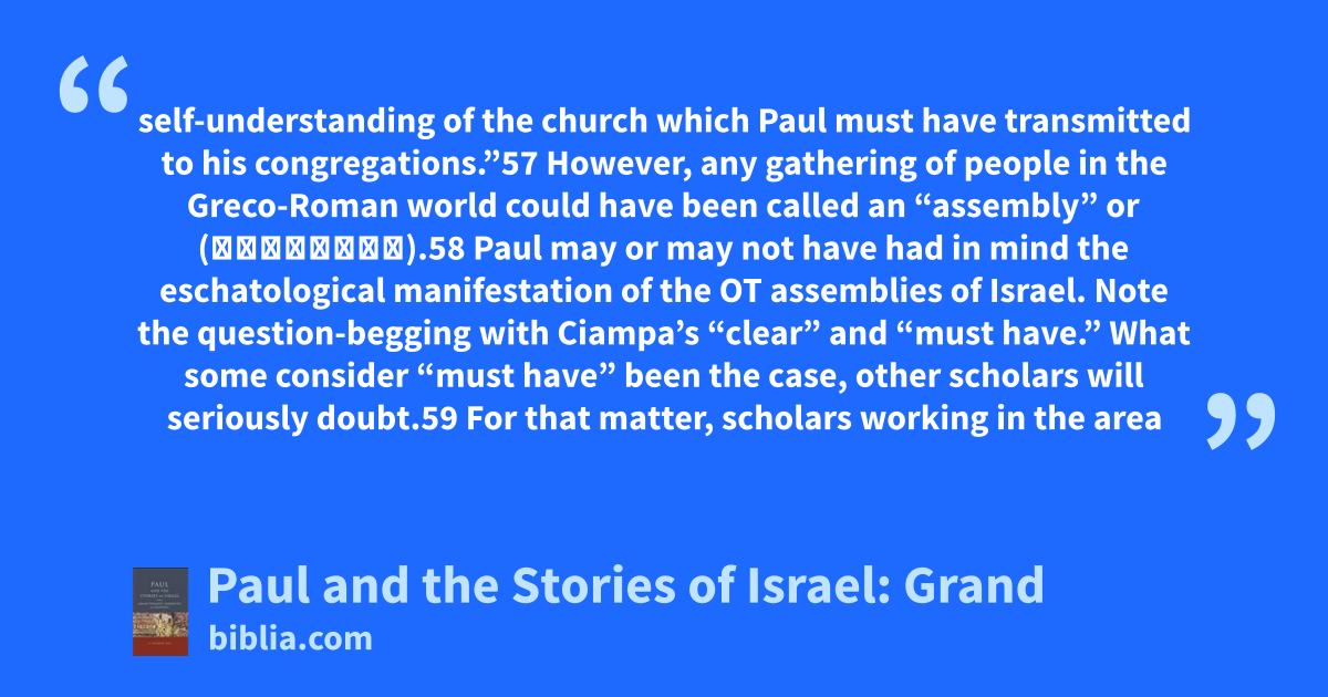 self-understanding of the church which Paul must have transmitted to his congregations.”57 However, any gathering of people in the Greco-Roman world could have been called an “assembly” or (ἐκκλησία).58 Paul may or may not have had in mind the eschatological manifestation of the OT assemblies of Israel. Note the question-begging with Ciampa’s “clear” and “must have.” What some consider “must have” been the case, other scholars will seriously doubt.59 For that matter, scholars working in the area