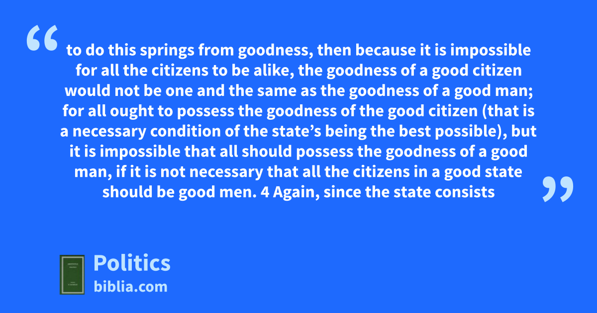 to do this springs from goodness, then because it is impossible for all the citizens to be alike, the goodness of a good citizen would not be one and the same as the goodness of a good man; for all ought to possess the goodness of the good citizen (that is a necessary condition of the state’s being the best possible), but it is impossible that all should possess the goodness of a good man, if it is not necessary that all the citizens in a good state should be good men. 4 Again, since the state consists