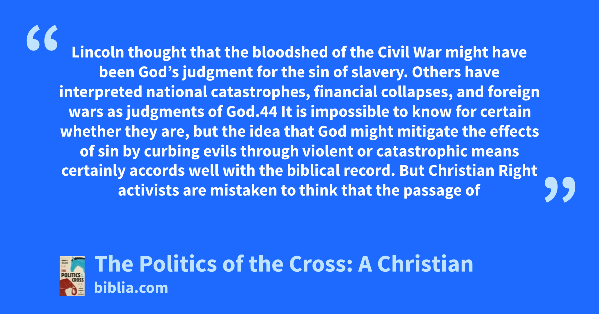 Lincoln thought that the bloodshed of the Civil War might have been God’s judgment for the sin of slavery. Others have interpreted national catastrophes, financial collapses, and foreign wars as judgments of God.44 It is impossible to know for certain whether they are, but the idea that God might mitigate the effects of sin by curbing evils through violent or catastrophic means certainly accords well with the biblical record. But Christian Right activists are mistaken to think that the passage of