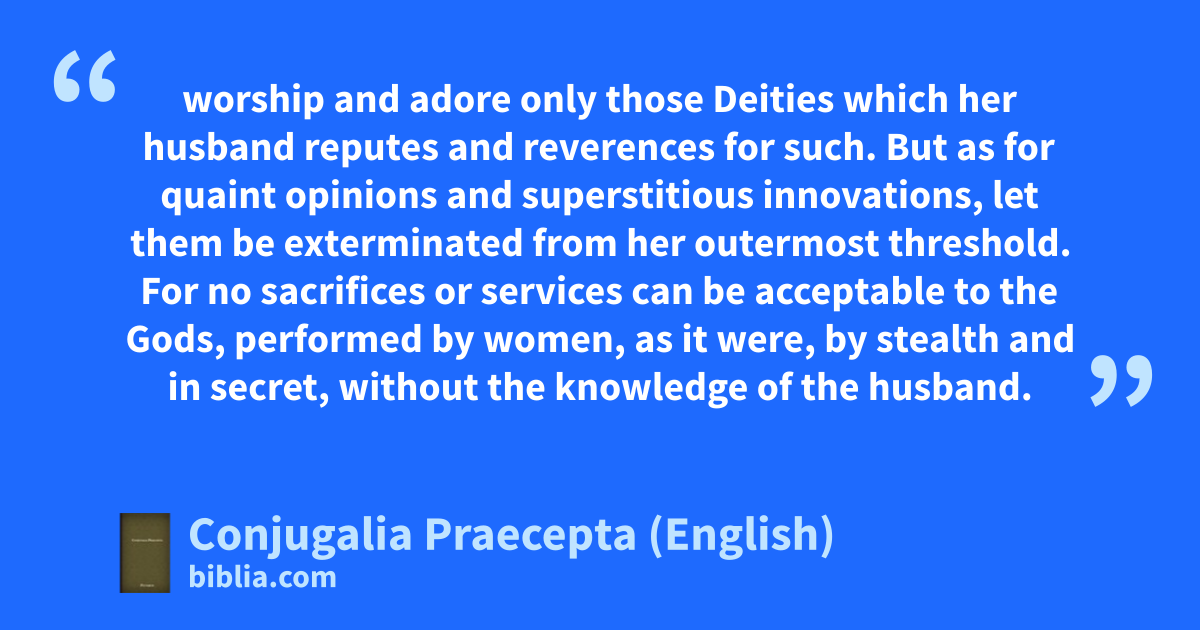 worship and adore only those Deities which her husband reputes and reverences for such. But as for quaint opinions and superstitious innovations, let them be exterminated from her outermost threshold. For no sacrifices or services can be acceptable to the Gods, performed by women, as it were, by stealth and in secret, without the knowledge of the husband.
