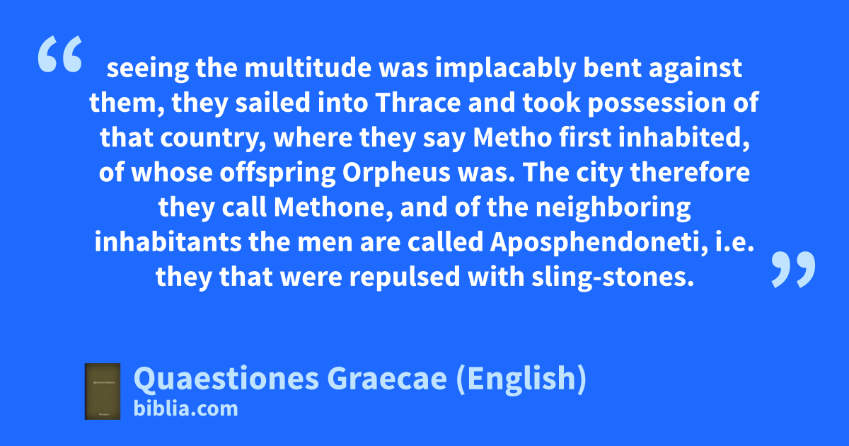 seeing the multitude was implacably bent against them, they sailed into Thrace and took possession of that country, where they say Metho first inhabited, of whose offspring Orpheus was. The city therefore they call Methone, and of the neighboring inhabitants the men are called Aposphendoneti, i.e. they that were repulsed with sling-stones.