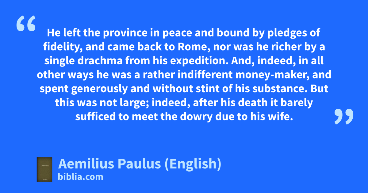 He left the province in peace and bound by pledges of fidelity, and came back to Rome, nor was he richer by a single drachma from his expedition. And, indeed, in all other ways he was a rather indifferent money-maker, and spent generously and without stint of his substance. But this was not large; indeed, after his death it barely sufficed to meet the dowry due to his wife.