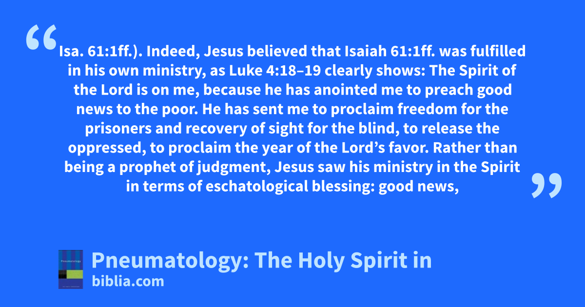 Isa. 61:1ff.). Indeed, Jesus believed that Isaiah 61:1ff. was fulfilled in his own ministry, as Luke 4:18–19 clearly shows: The Spirit of the Lord is on me, because he has anointed me to preach good news to the poor. He has sent me to proclaim freedom for the prisoners and recovery of sight for the blind, to release the oppressed, to proclaim the year of the Lord’s favor. Rather than being a prophet of judgment, Jesus saw his ministry in the Spirit in terms of eschatological blessing: good news,