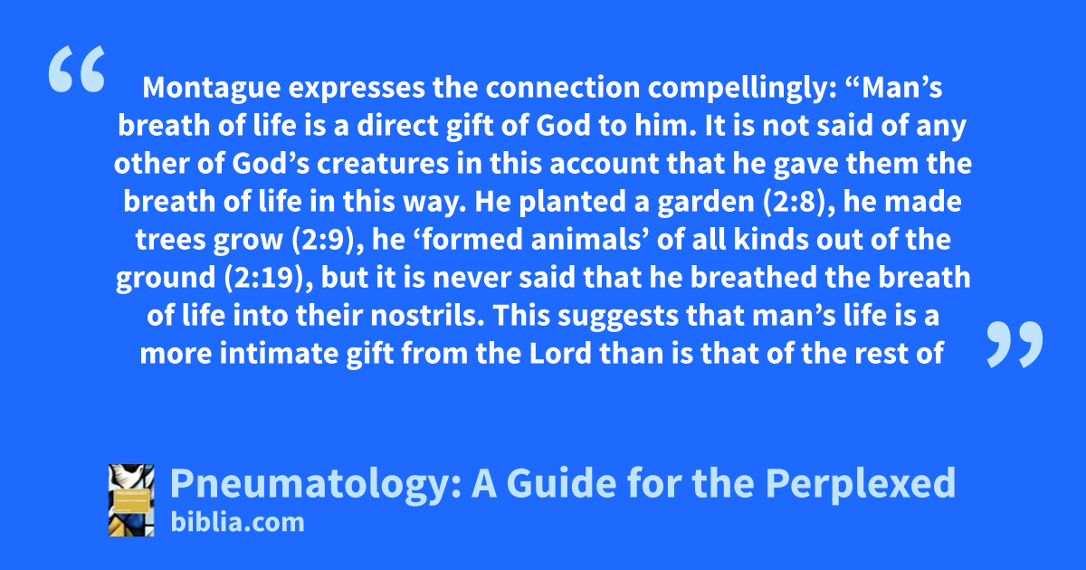 Montague expresses the connection compellingly: “Man’s breath of life is a direct gift of God to him. It is not said of any other of God’s creatures in this account that he gave them the breath of life in this way. He planted a garden (2:8), he made trees grow (2:9), he ‘formed animals’ of all kinds out of the ground (2:19), but it is never said that he breathed the breath of life into their nostrils. This suggests that man’s life is a more intimate gift from the Lord than is that of the rest of