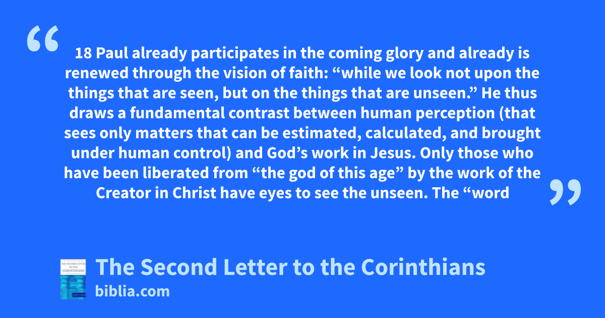 18 Paul already participates in the coming glory and already is renewed through the vision of faith: “while we look not upon the things that are seen, but on the things that are unseen.” He thus draws a fundamental contrast between human perception (that sees only matters that can be estimated, calculated, and brought under human control) and God’s work in Jesus. Only those who have been liberated from “the god of this age” by the work of the Creator in Christ have eyes to see the unseen. The “word