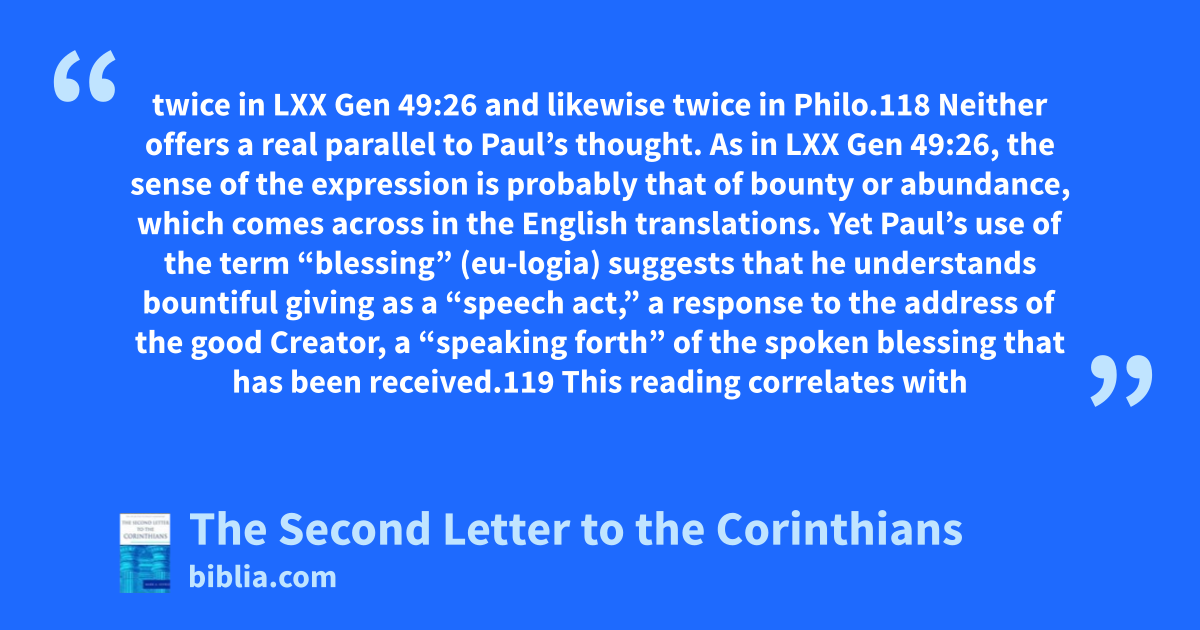 twice in LXX Gen 49:26 and likewise twice in Philo.118 Neither offers a real parallel to Paul’s thought. As in LXX Gen 49:26, the sense of the expression is probably that of bounty or abundance, which comes across in the English translations. Yet Paul’s use of the term “blessing” (eu-logia) suggests that he understands bountiful giving as a “speech act,” a response to the address of the good Creator, a “speaking forth” of the spoken blessing that has been received.119 This reading correlates with