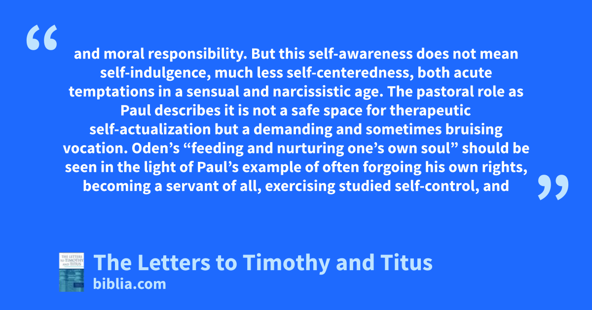and moral responsibility. But this self-awareness does not mean self-indulgence, much less self-centeredness, both acute temptations in a sensual and narcissistic age. The pastoral role as Paul describes it is not a safe space for therapeutic self-actualization but a demanding and sometimes bruising vocation. Oden’s “feeding and nurturing one’s own soul” should be seen in the light of Paul’s example of often forgoing his own rights, becoming a servant of all, exercising studied self-control, and