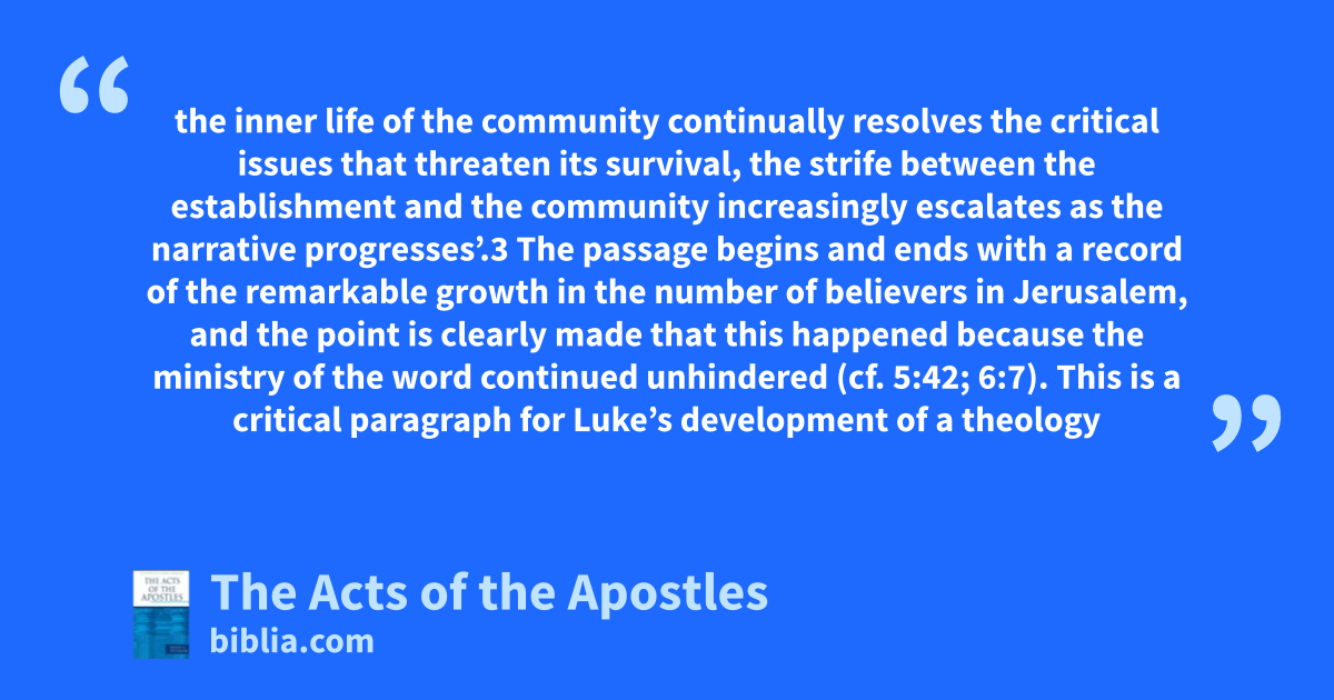 the inner life of the community continually resolves the critical issues that threaten its survival, the strife between the establishment and the community increasingly escalates as the narrative progresses’.3 The passage begins and ends with a record of the remarkable growth in the number of believers in Jerusalem, and the point is clearly made that this happened because the ministry of the word continued unhindered (cf. 5:42; 6:7). This is a critical paragraph for Luke’s development of a theology
