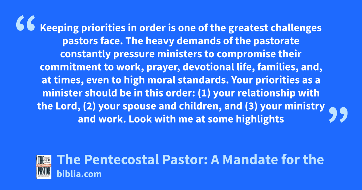 Keeping priorities in order is one of the greatest challenges pastors face. The heavy demands of the pastorate constantly pressure ministers to compromise their commitment to work, prayer, devotional life, families, and, at times, even to high moral standards. Your priorities as a minister should be in this order: (1) your relationship with the Lord, (2) your spouse and children, and (3) your ministry and work. Look with me at some highlights