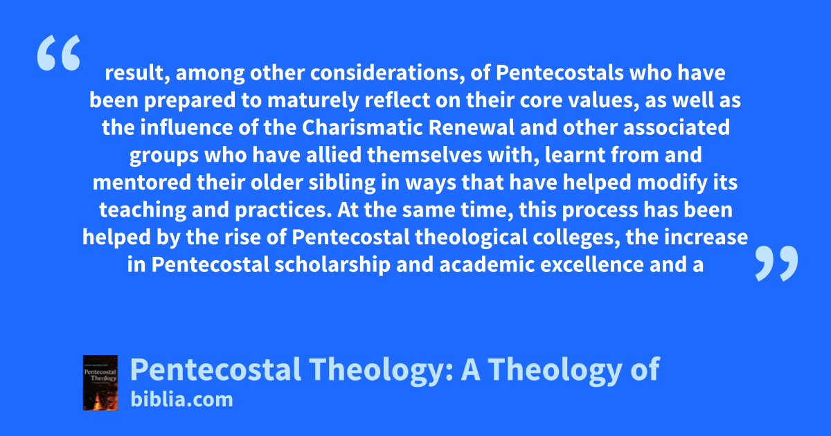 result, among other considerations, of Pentecostals who have been prepared to maturely reflect on their core values, as well as the influence of the Charismatic Renewal and other associated groups who have allied themselves with, learnt from and mentored their older sibling in ways that have helped modify its teaching and practices. At the same time, this process has been helped by the rise of Pentecostal theological colleges, the increase in Pentecostal scholarship and academic excellence and a