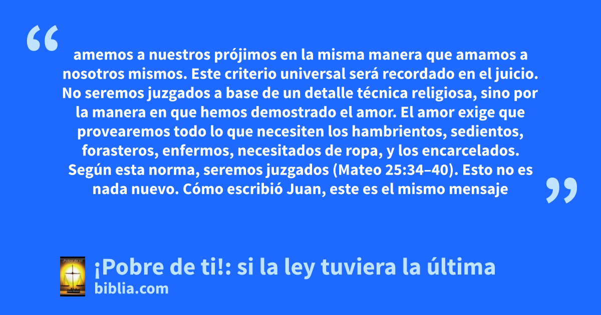 amemos a nuestros prójimos en la misma manera que amamos a nosotros mismos. Este criterio universal será recordado en el juicio. No seremos juzgados a base de un detalle técnica religiosa, sino por la manera en que hemos demostrado el amor. El amor exige que provearemos todo lo que necesiten los hambrientos, sedientos, forasteros, enfermos, necesitados de ropa, y los encarcelados. Según esta norma, seremos juzgados (Mateo 25:34–40). Esto no es nada nuevo. Cómo escribió Juan, este es el mismo mensaje